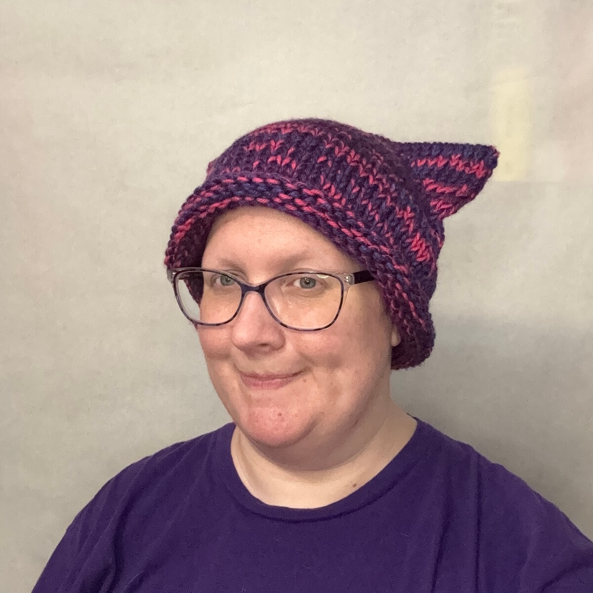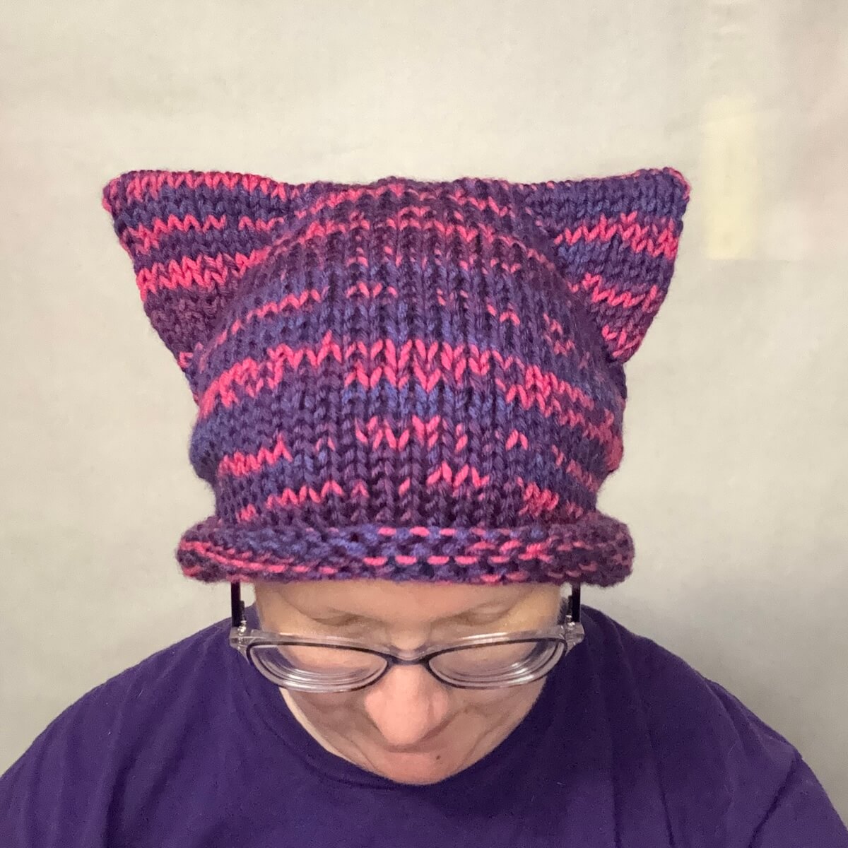 This bi-pride and purple beanie hat has the bisexual pride flag colors (pink, purple, and blue), adorable cat ears, and is extra cozy because of its double-strand knit construction.